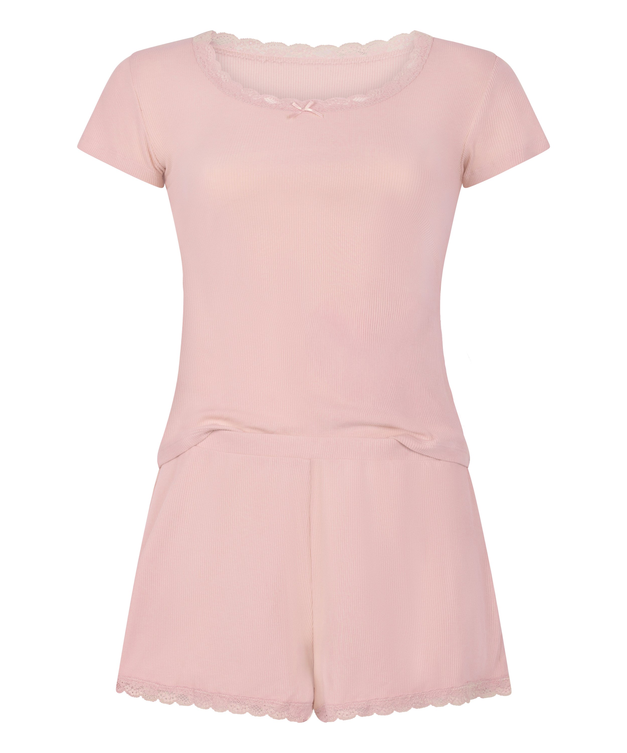 Ce pyjama à manches courtes, à l'encolure ronde et aux détails en dentelle, est très confortable. Le tissu doux et extensible assure un bon confort pour la nuit.
