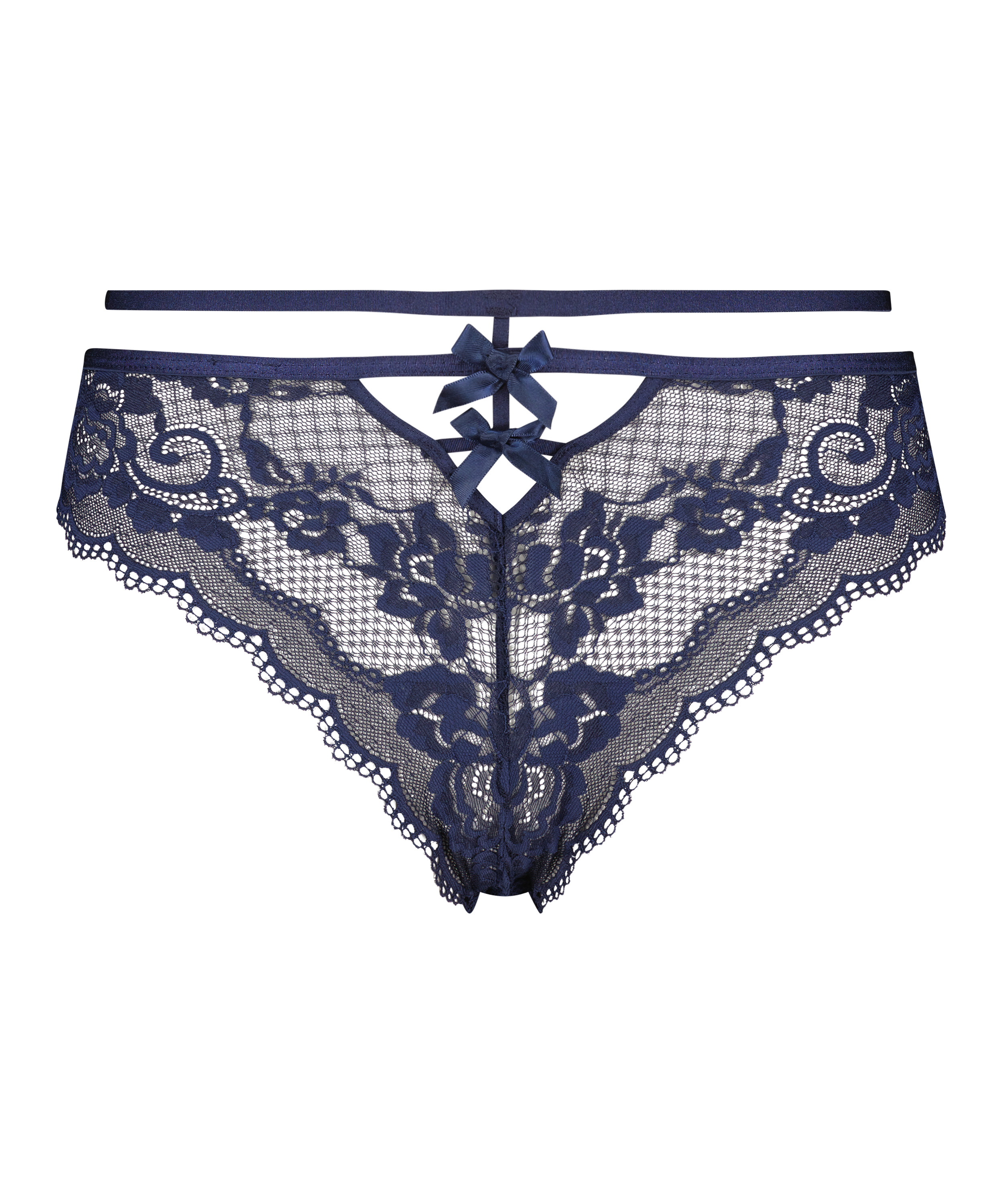 Vous ne devez pas passer à côté de ce mignon petit slip brésilien ! Il est fait de belle dentelle et a des détails de lanières et de découpes et comme touche finale de jolis nœuds dans le dos. À porter en combinaison avec votre soutien-gorge ou brassière préféré(e).