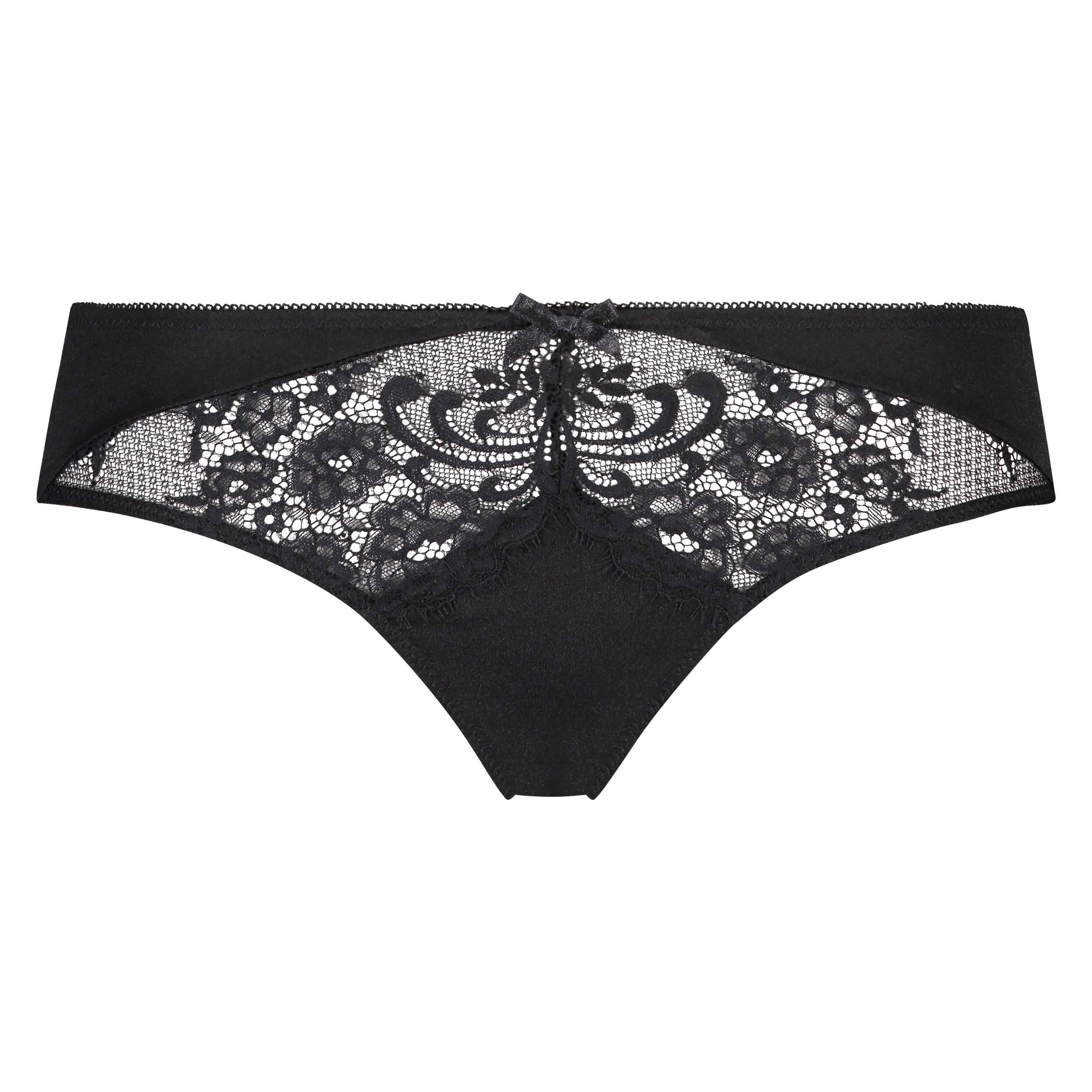 Ce slip brésilien est confectionné en dentelle et en microfibre. Le dos est entièrement en dentelle. Le nœud papillon à l'avant constitue la touche finale !