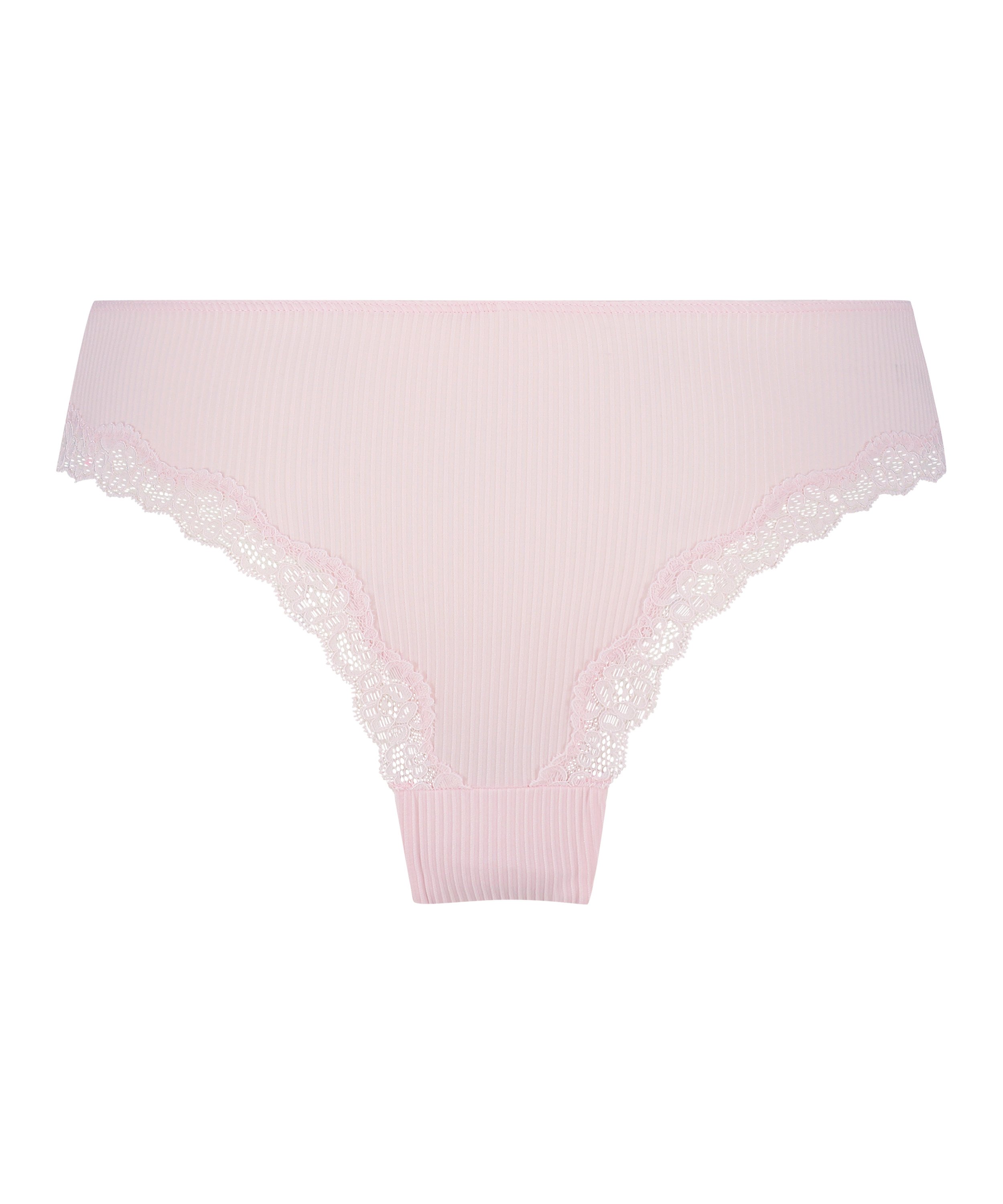 Ce slip brésilien est un must ! Il est confectionné dans un tissu côtelé et est orné d'une bordure en dentelle. Le slip brésilien est décoré avec un petit nœud à l'avant. Complétez votre ensemble avec le soutien-gorge assorti.