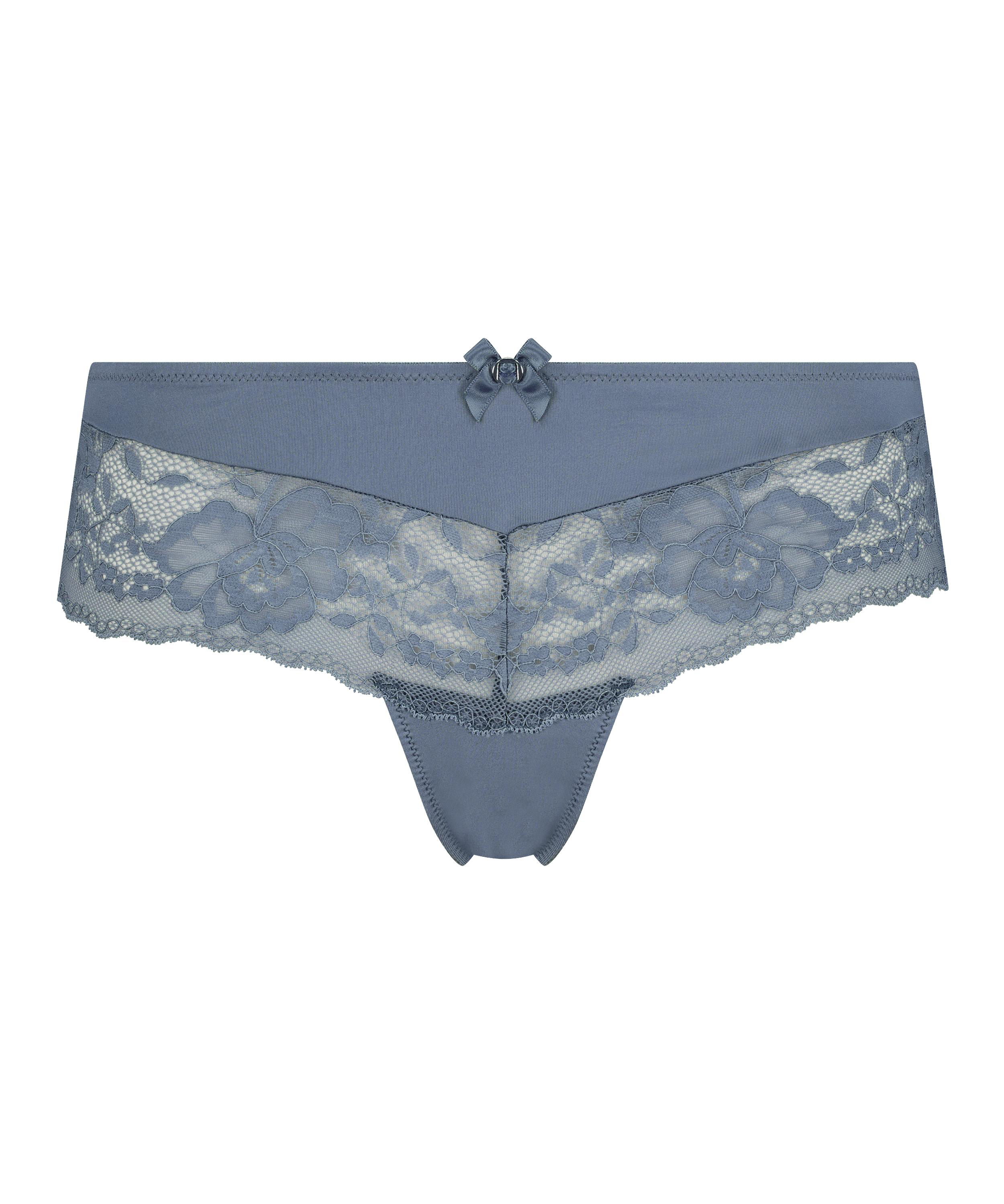 Slip brésilien réalisé à dentelle semi-transparente et tissu brillant. Le slip brésilien est décoré d’un petit nœud raffiné devant. Combinez ce slip avec le soutien-gorge assorti pour compléter votre parure !