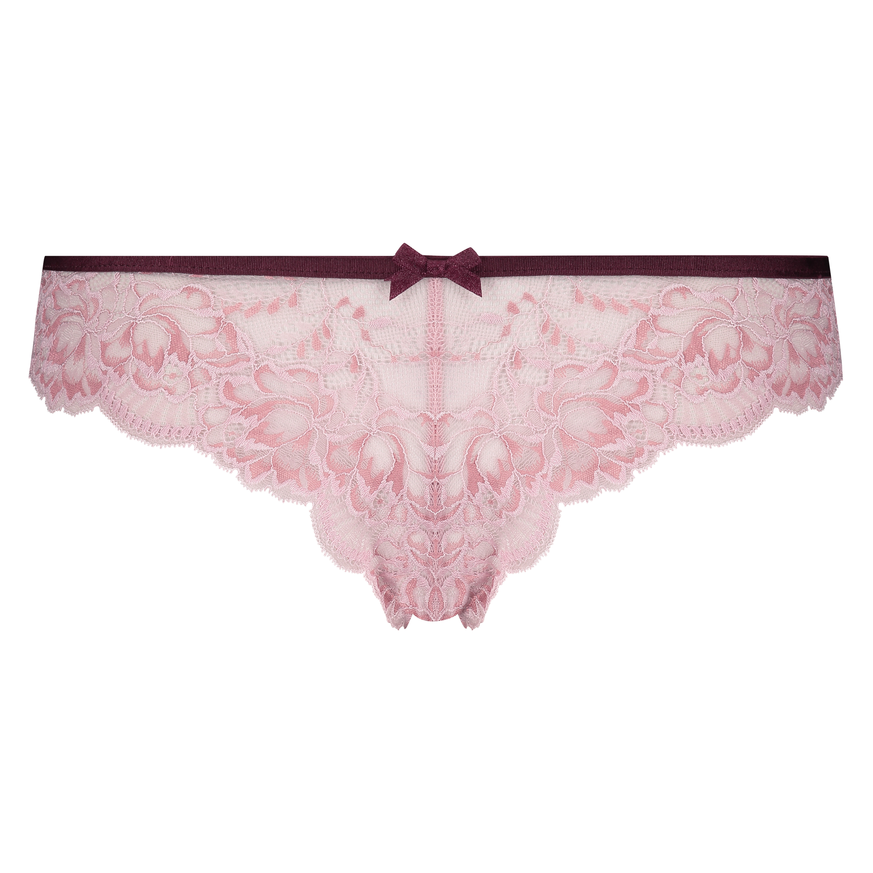 Ce joli slip brésilien accentue magnifiquement votre féminité ! Il est réalisé dans une qualité dentelle semi-transparente et est décoré d’un charmant petit nœud au milieu.