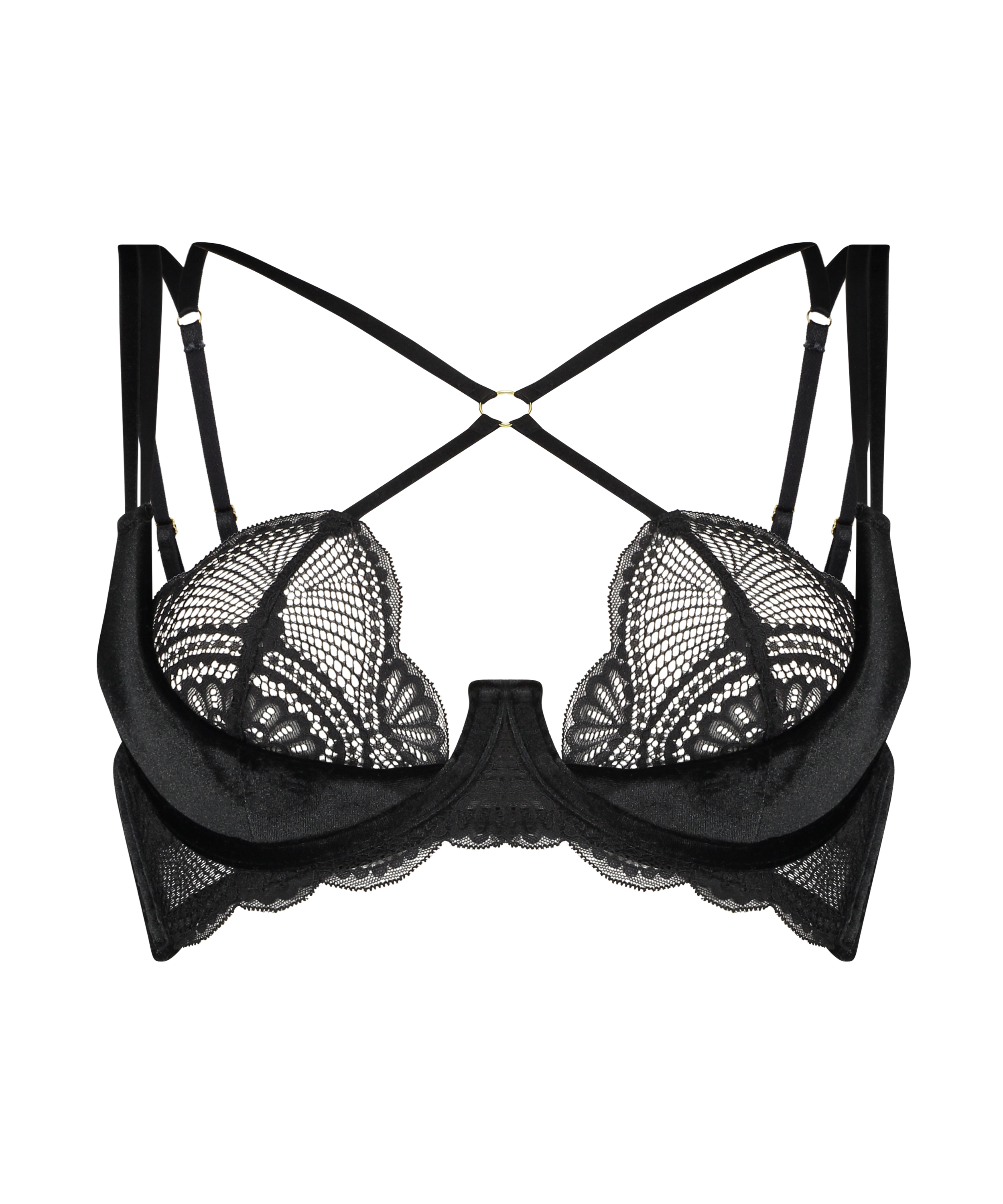 Ce soutien-gorge est super beau et sexy à la fois! Il est composé d'une combinaison de dentelle et de velours. Le soutien-gorge a des détails à bretelles séduisants sur le devant. À combiner avec une culotte assortie pour créer l'ensemble parfait !