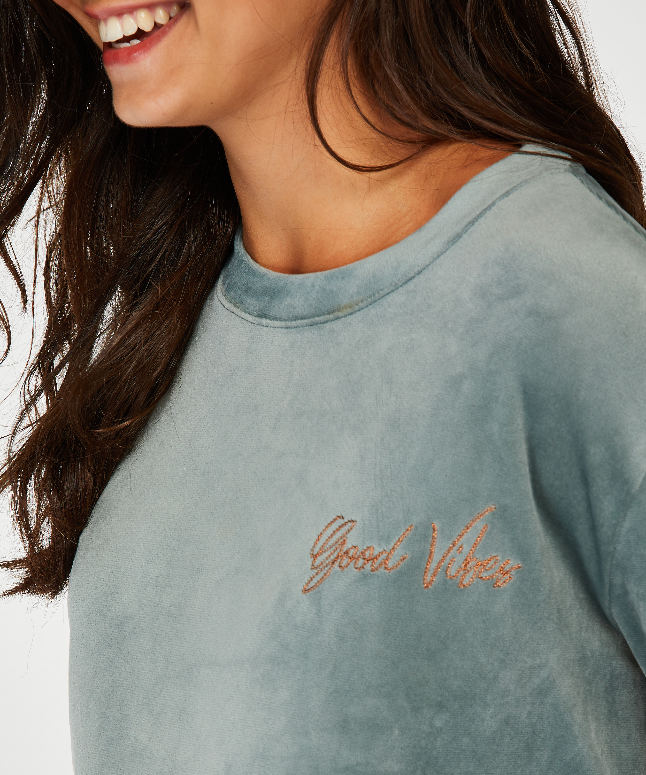 Ce haut super doux en velours que vous ne voudrez porter que pendant votre grossesse ! Il y a assez de place pour votre ventre qui s'arrondit. À combiner avec le pantalon assorti.